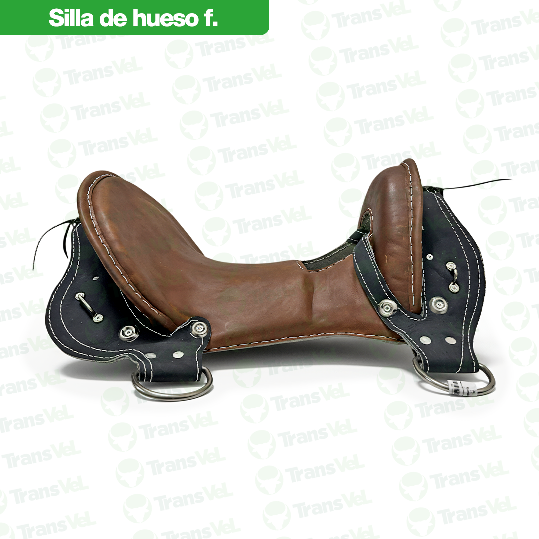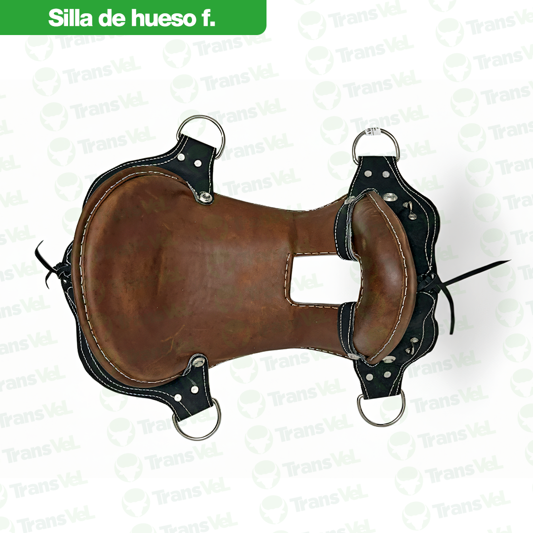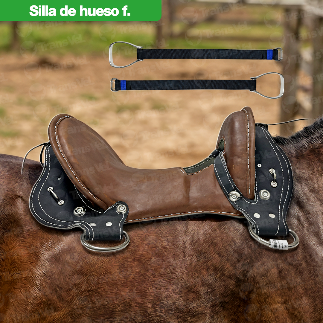 Silla de trabajo forrada en cuero, con 2 arciones y 2 estribos de aluminio, ligera, resistente y cómoda para largas jornadas de trabajo con equinos.